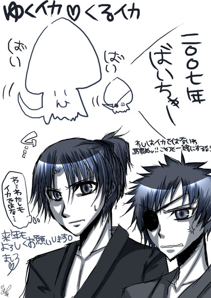 遅くなりましたが、明けました。 写メ日記(左メニューからどうぞ)見てる方は 分かると思いますが、かなりやばい状態です。 またしばらくは写メ日記から生存確認お願いしますあばば。 セールとか行きたかったな...ほんまに。 色々忙しいですが、今年もまったり更新していきたいと思います。 今年もって、去年の暮からスタートしたブログなので この表現はちょっとおかしいですが;苦笑 とりあえず1年続くように頑張りたいです! ↓今描きたい絵リスト↓ BASARA:チカ幸、瀬戸内+みったん、織田軍(光受) 戦無:光秀親子、蘭光ハァハァ、義トリオ+元親 三無:司馬懿、丕司馬 弐寺:キラリヒ、セム兄、士郎たん、ニクスくん、デュエルん、 タンピ、ジェノたん、白虎たん、サイレン一家 ポプ;Deuil、学園キャラ、デスキャラ テイルズ:クラトス、ユアンさま、ルーク、アッス、ジョニー その他:神田さん、獄寺くん、ヒバキョン 昔ハマったキャラやCPが今異常に描きたい! 久しぶりにハヤト受とか、クラパパ受とか赤毛とか描きたい! WJ系も久しぶりに描いてみたいw あ、女の子がガラシャしかいない...w きっと今年も男だらけのブログになります。 *** 今日の絵はちょっと前にアプした年賀絵の全体図ですー 今年の年賀状コレでした。毎年干支関係ないですw では、今年もどうぞよろしくお願いします^^ 2007.12.31 Mon 21:58:25